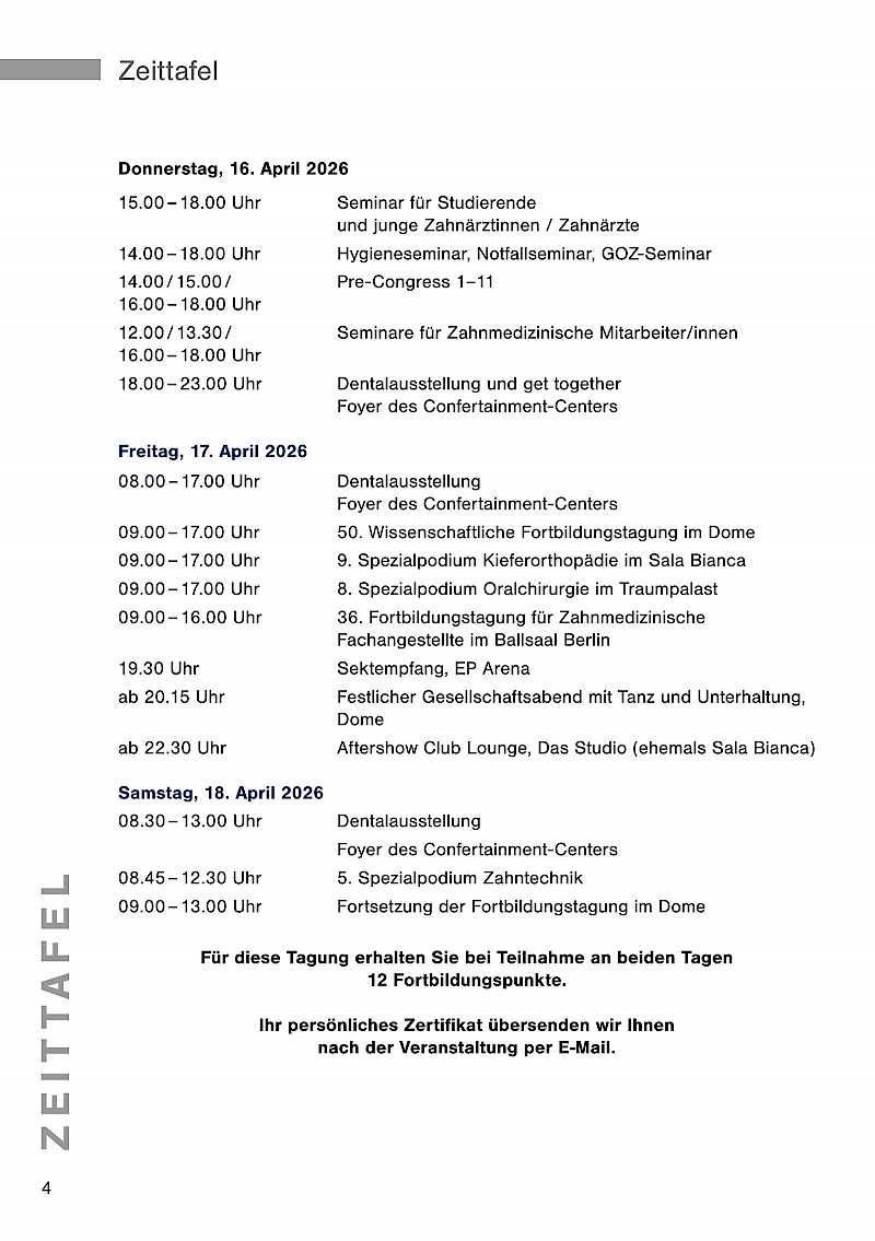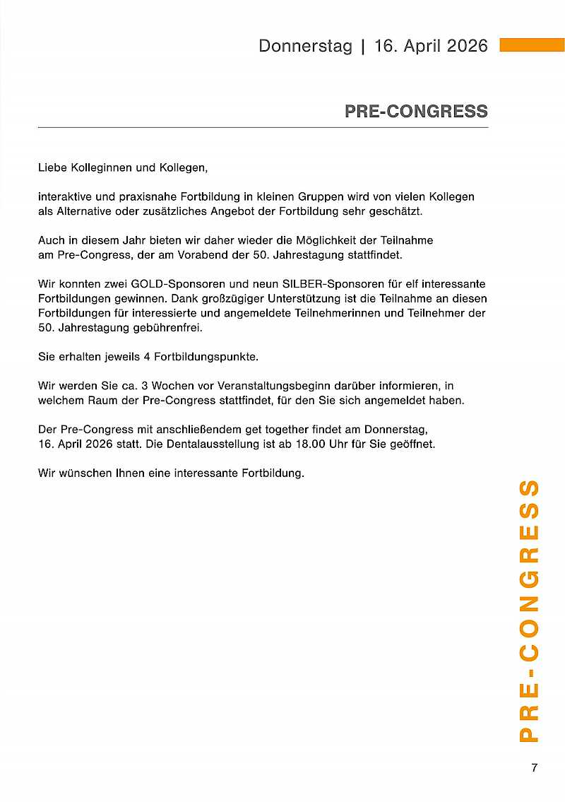 Der Pre-Congress mit anschließendem get together findet am Donnerstag, 16. April 2026 statt. Die Dentalausstellung ist ab 18.00 Uhr für Sie geöffnet.