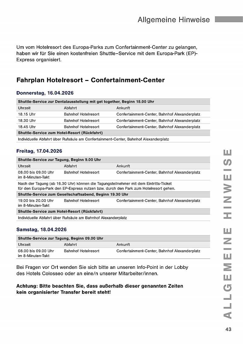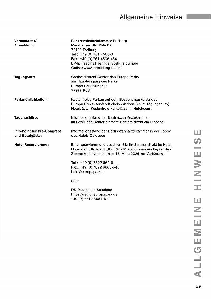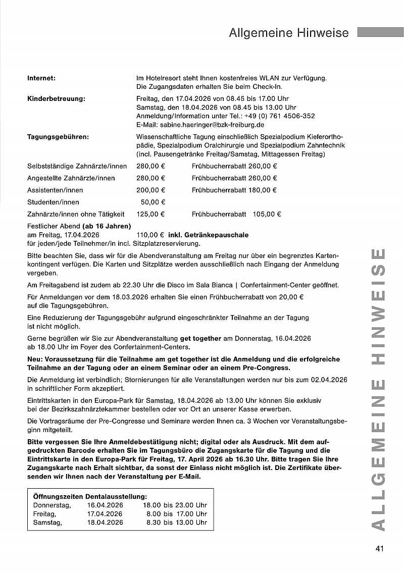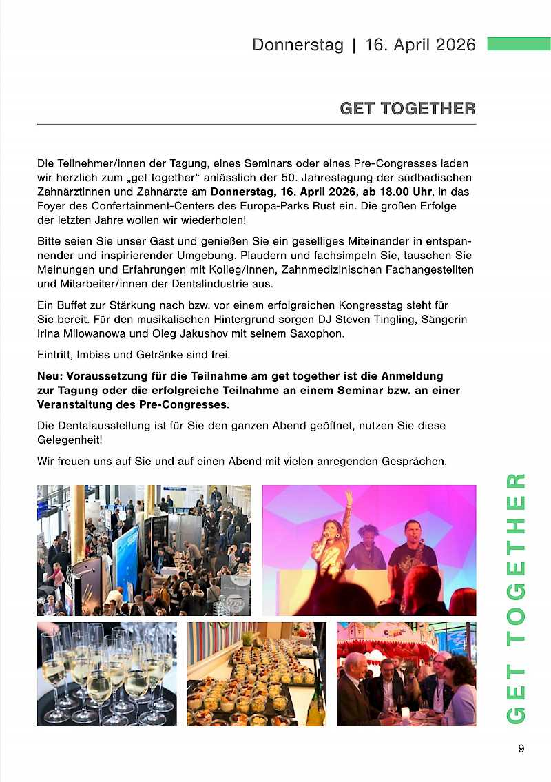 Die Teilnehmer/innen der Tagung, eines Seminars oder eines Pre-Congresses laden wir herzlich zum „get together“ anlässlich der 50. Jahrestagung der südbadischen Zahnärztinnen und Zahnärzte am Donnerstag, 16. April 2026, ab 18.00 Uhr, in das Foyer des Confertainment-Centers des Europa-Parks Rust ein. Die großen Erfolge der letzten Jahre wollen wir wiederholen!