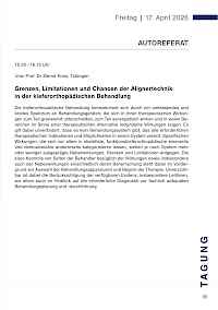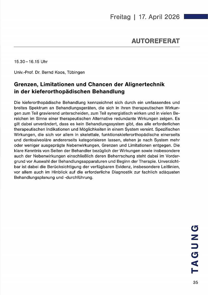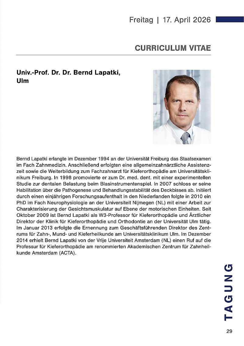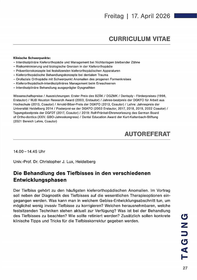 Der Tiefbiss gehört zu den häufigsten kieferorthopädischen Anomalien. Im Vortrag soll neben der Diagnostik des Tiefbisses auf die wesentlichen Therapieoptionen eingegangen werden. Was kann man in welchem Gebiss-Entwicklungsabschnitt tun, um möglichst wenig invasiv Tiefbisse zu korrigieren? Welchen herausnehmbaren, welche festsitzenden Techniken stehen aktuell zur Verfügung? Was ist bei der Behandlung des Tiefbisses zu beachten? Wie sollte retiniert werden? Zusätzlich sollen konkrete klinische Tipps und Tricks für die Tiefbisskorrektur gegeben werden.