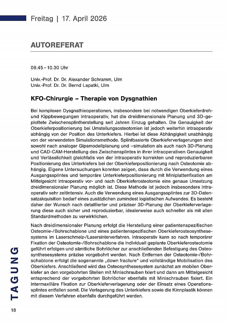 Bei komplexen Dysgnathieoperationen, insbesondere bei notwendigen Oberkieferdrehungen und Kippbewegungen intraoperativ, hat die dreidimensionale Planung und 3D-geplotete Zwischenokklusionsschablone seit Jahren Einzug gehalten. Die Genauigkeit der Oberkieferpositionierung bei Umstellungsosteotomien ist jedoch weiterhin intraoperativ abhängig von der Position des Unterkiefers. Hierbei ist diese Abhängigkeit unabhängig von der verwendeten Simulationsmethode. Splintbasierte Oberkieferverlagerungen sind sowohl nach analoger Gipsmodellplanung und –simulation als auch nach 3D-Planung und CAD-CAM-Herstellung des Zwischensplintes in ihrer intraoperativen Genauigkeit und Verlässlichkeit gleichfalls von der intraoperativ korrekten und reproduzierbaren Positionierung des Unterkiefers bei der Oberkieferpositionierung nach Osteotomie abhängig. Eigene Untersuchungen konnten zeigen, dass durch die Verwendung eines Ausgangssplintes und temporäre Unterkieferpositionierung mit Miniplattenfixation am Mittelgesicht intraoperativ vor- und nach Oberkieferosteotomie eine genaue Umsetzung dreidimensionaler Planung möglich ist. Diese Methode ist jedoch insbesondere intraoperativ sehr zeitintensiv. Auch die Verwendung eines Ausgangssplintes zur 3D-Datensatzakquisition bedarf eines zusätzlichen zumindest logistischen Aufwandes. Es besteht daher der Wunsch nach detaillierter und präziser 3D-Planung der Oberkieferverlagerung diese auch sicher und reproduzierbar, idealerweise auch schneller als mit allen Standardmethoden zu verwirklichen.