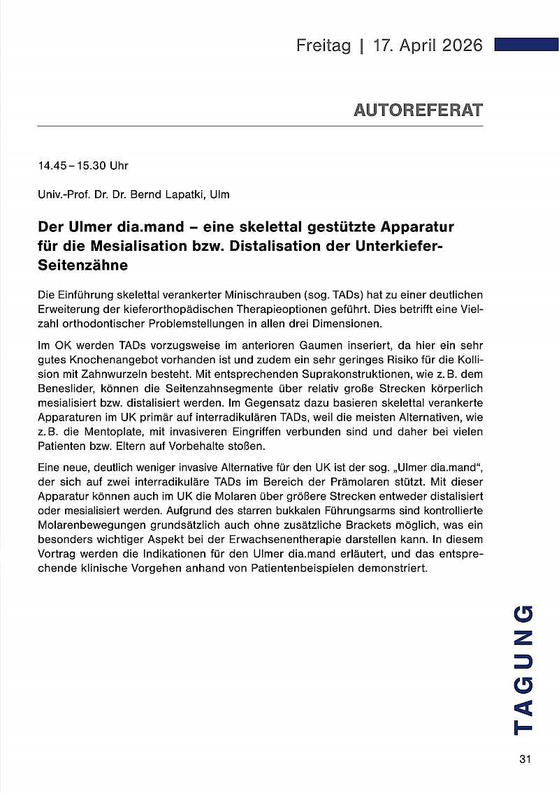 Eine neue, deutlich weniger invasive Alternative für den UK ist der sog. "Ulmer dia.mand", der sich auf zwei interradikuläre TADs im Bereich der Prämolaren stützt. Mit dieser Apparatur können auch im UK die Molaren über größere Strecken entweder distalisiert oder mesialisiert werden. Aufgrund des starren bukkalen Führungsarms sind kontrollierte Molarenbewegungen grundsätzlich auch ohne zusätzliche Brackets möglich, was ein besonders wichtiger Aspekt bei der Erwachsenentherapie darstellen kann. In diesem Vortrag werden die Indikationen für den Ulmer dia.mand erläutert, und das entsprechende klinische Vorgehen anhand von Patientenbeispielen demonstriert.
