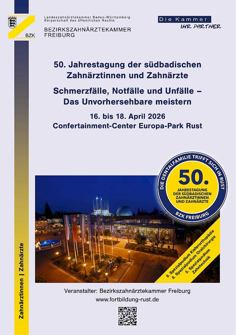 Die Teilnehmer/innen der Tagung, eines Seminars oder eines Pre-Congresses laden wir herzlich zum „get together“ anlässlich der 50. Jahrestagung der südbadischen Zahnärztinnen und Zahnärzte am Donnerstag, 16. April 2026, ab 18.00 Uhr, in das Foyer des Confertainment-Centers des Europa-Parks Rust ein. Die großen Erfolge der letzten Jahre wollen wir wiederholen!