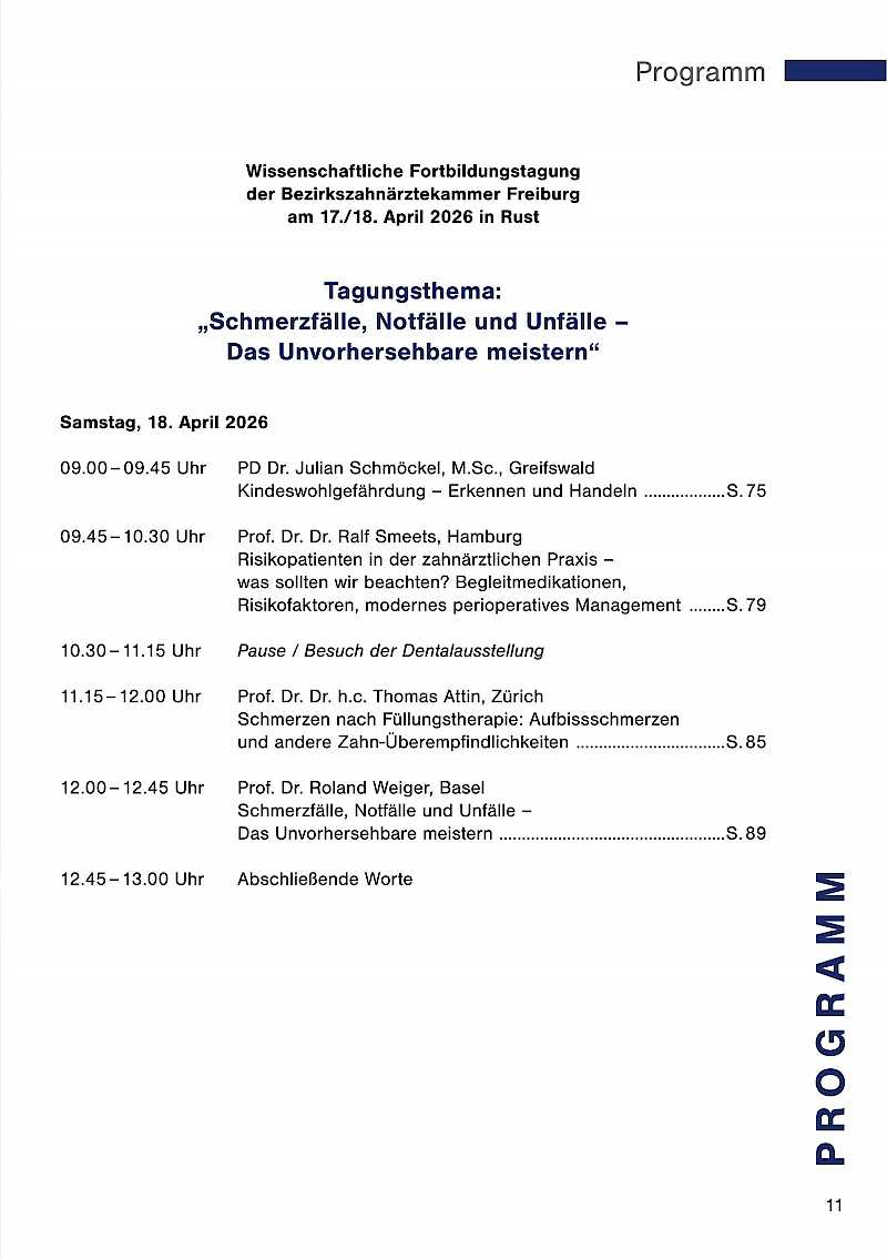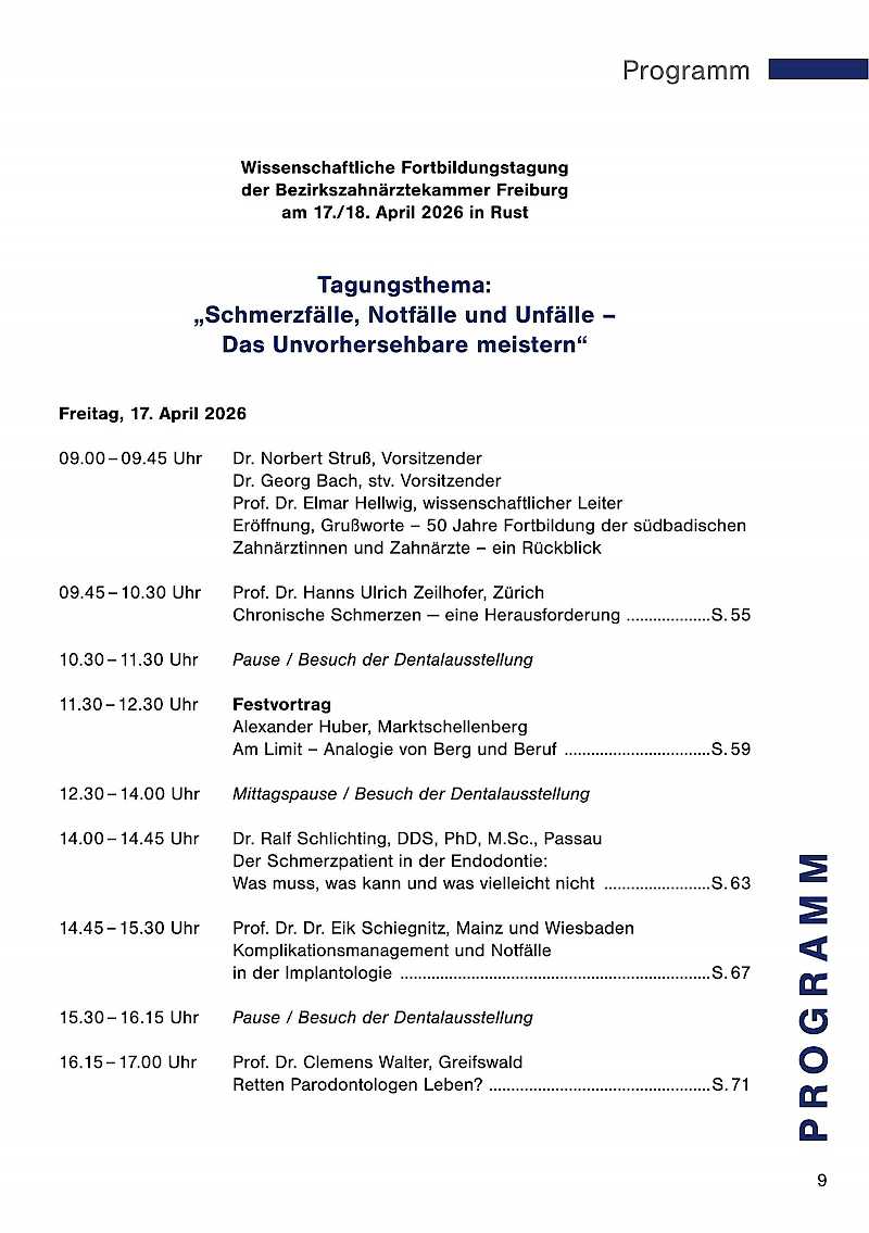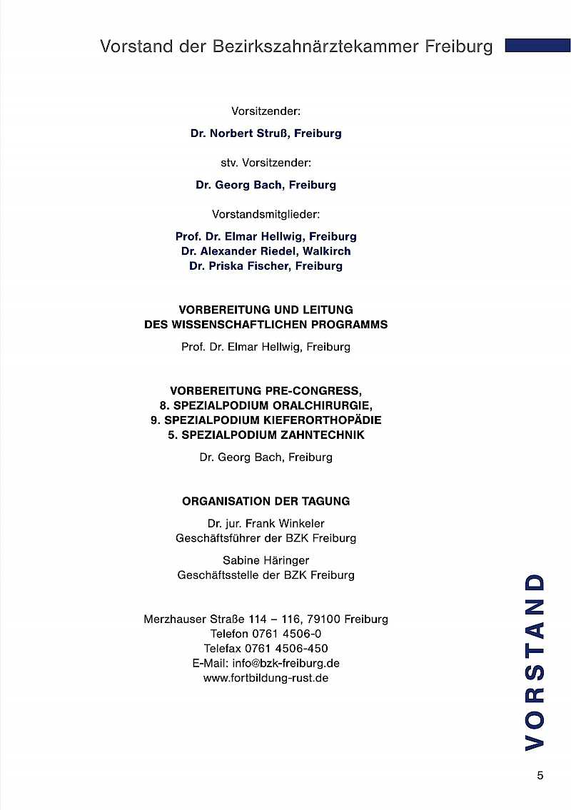 Seit geraumer Zeit findet unsere sympathische Tagung, die ja mehr ist als eine reine Fortbildungsveranstaltung, in Rust statt, das war aber nicht immer so! Sie werden erstaunt sein, an welchen Orten die Bezirkszahnärztekammer Freiburg ihre Jahrestagung bereits ausgerichtet hatte, wie unterschiedlich die Konzeptionen waren und wie sehr sich diese Traditionsveranstaltung gewandelt hat. Dies, geschmückt mit der einen oder anderen Anekdote und mit einem kleinen Augenzwinkern, erwartet Sie im Eröffnungsvortrag von Norbert Struß, Elmar Hellwig und Georg Bach.