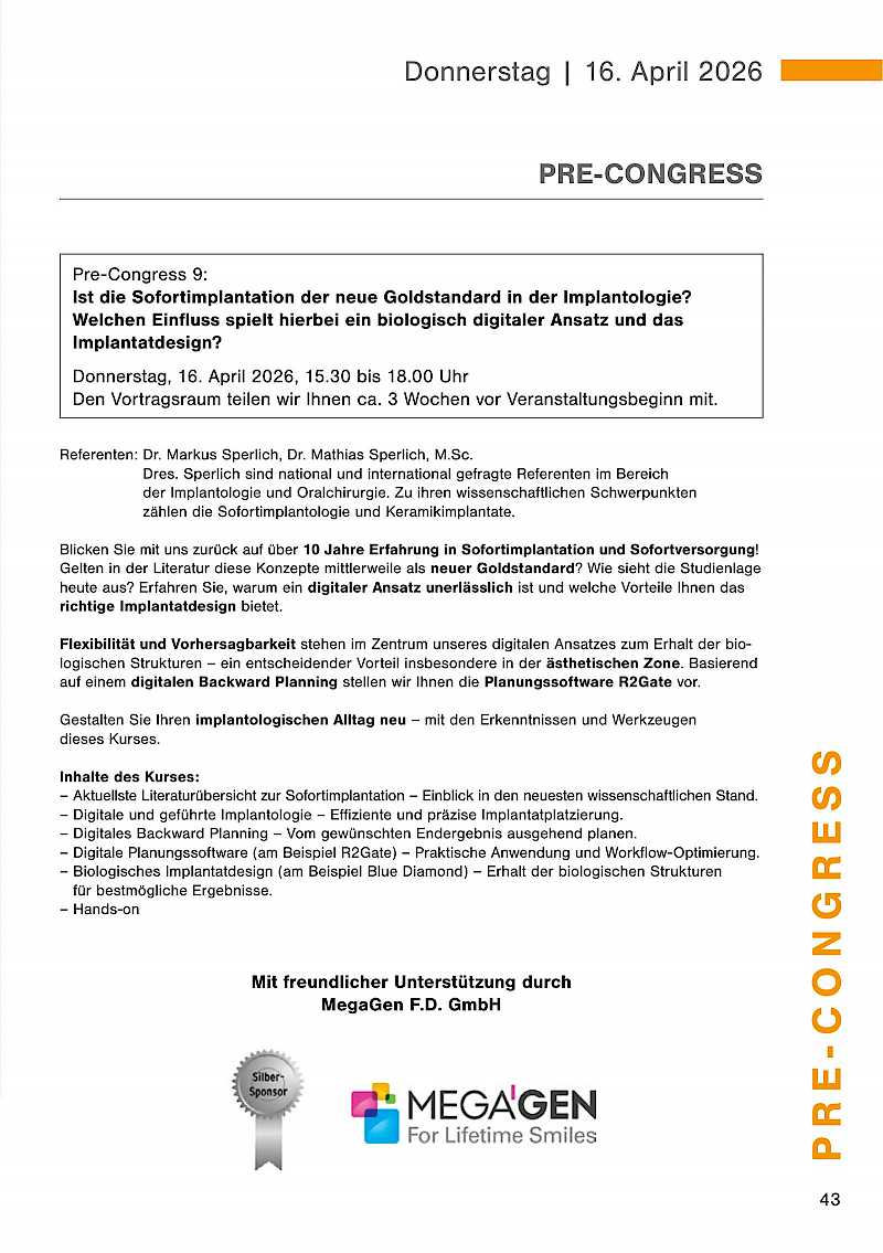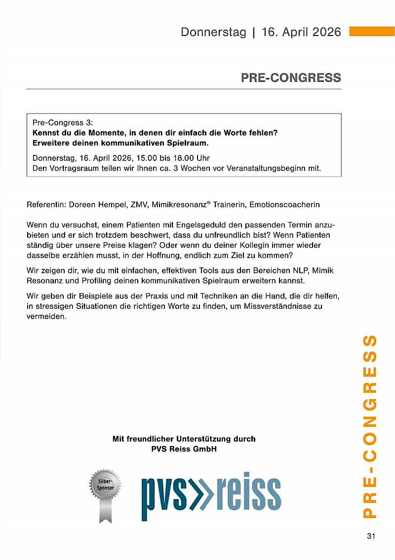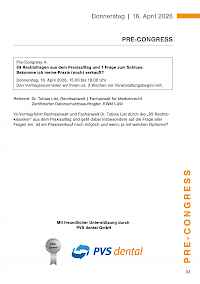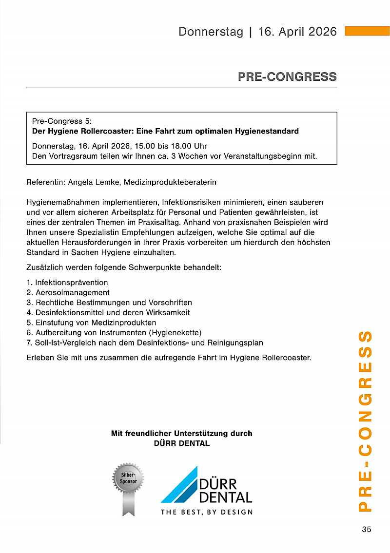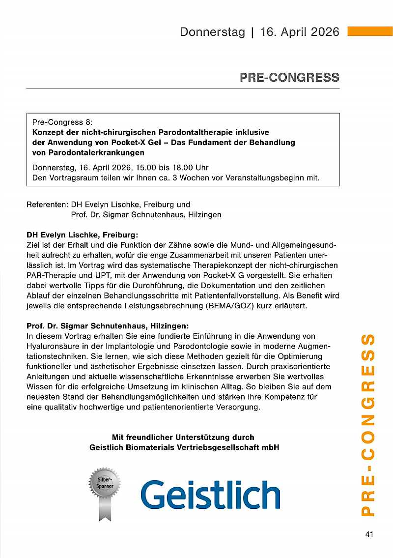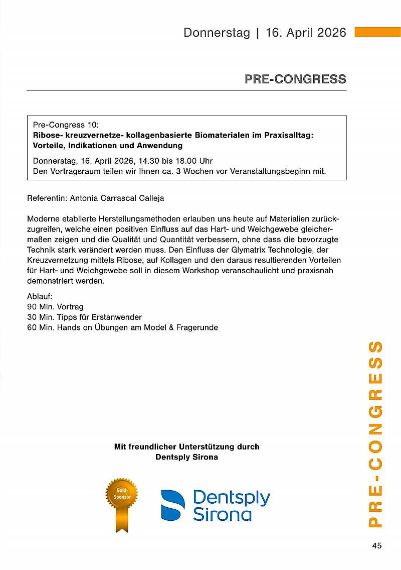 Der Pre-Congress mit anschließendem get together findet am Donnerstag, 16. April 2026 statt. Die Dentalausstellung ist ab 18.00 Uhr für Sie geöffnet.