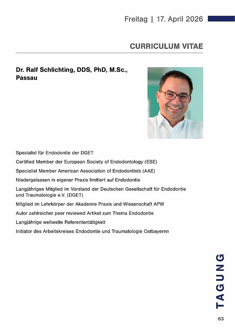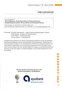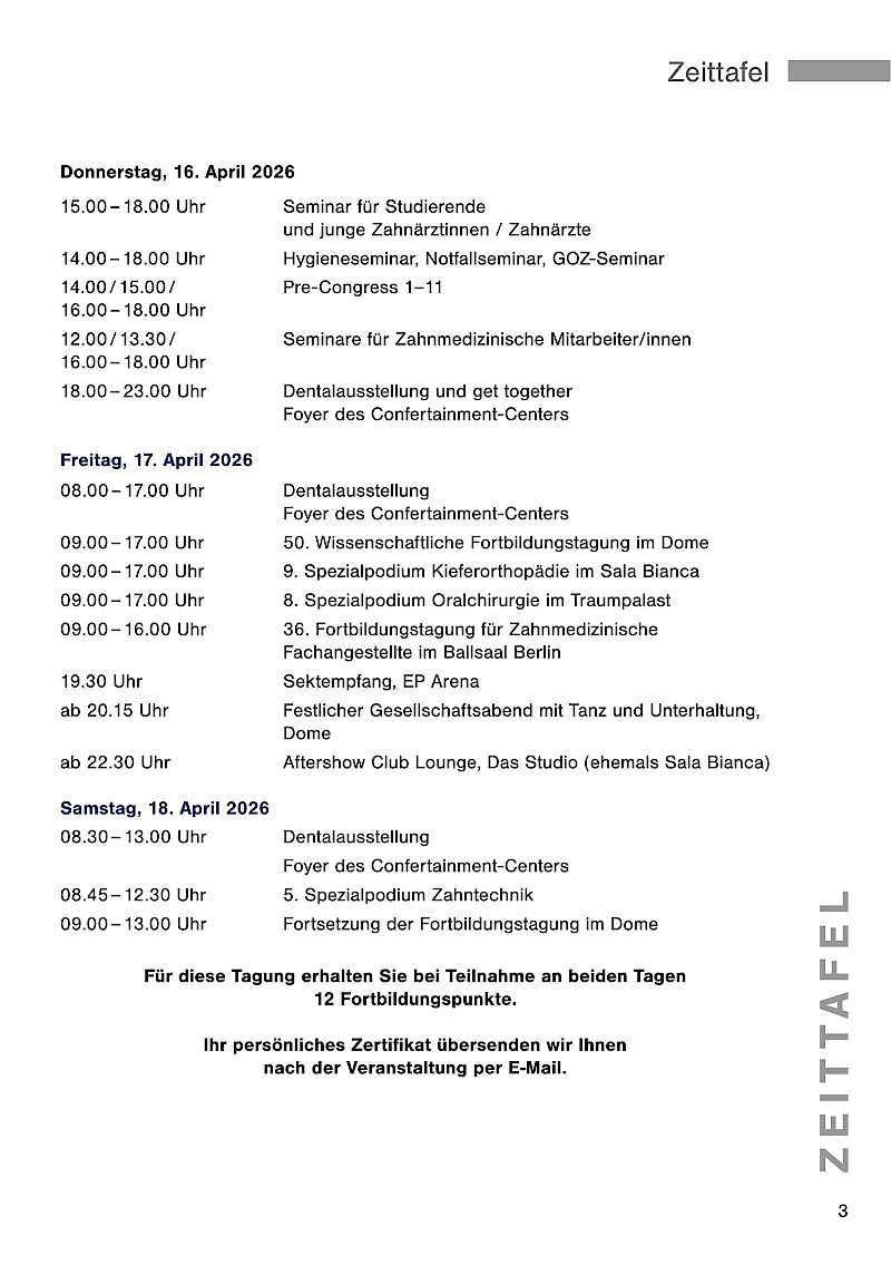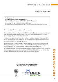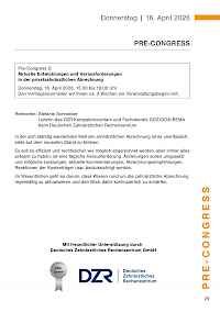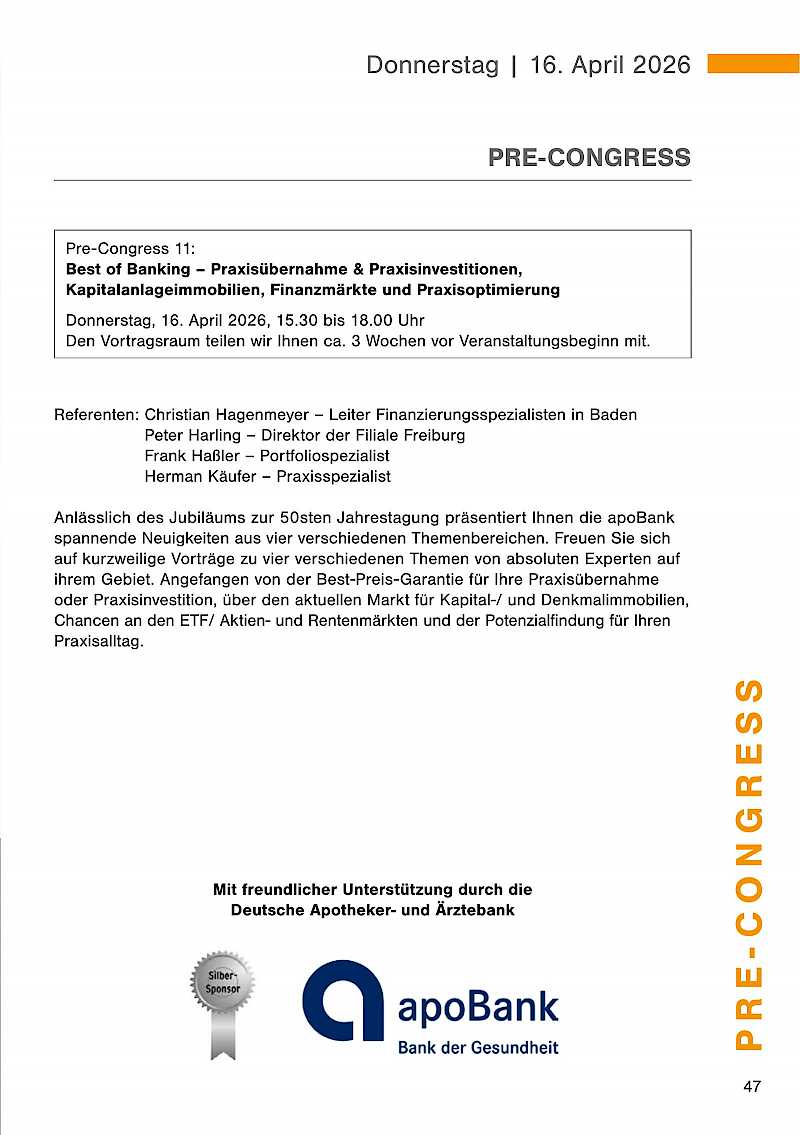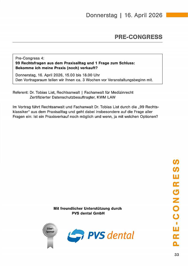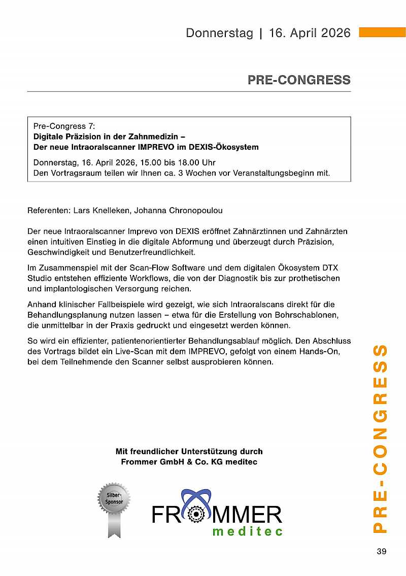 Der Pre-Congress mit anschließendem get together findet am Donnerstag, 16. April 2026 statt. Die Dentalausstellung ist ab 18.00 Uhr für Sie geöffnet.