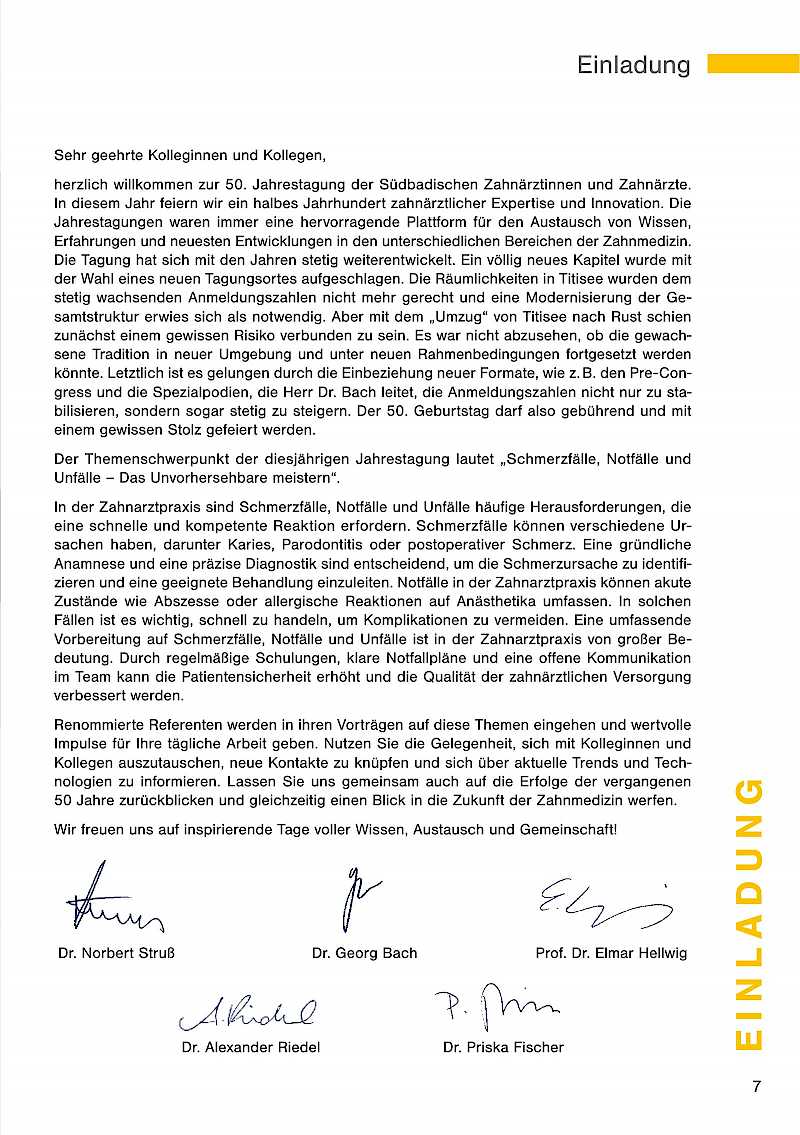 herzlich willkommen zur 50. Jahrestagung der Südbadischen Zahnärztinnen und Zahnärzte. In diesem Jahr feiern wir ein halbes Jahrhundert zahnärztlicher Expertise und Innovation. Die Jahrestagungen waren immer eine hervorragende Plattform für den Austausch von Wissen, Erfahrungen und neuesten Entwicklungen in den unterschiedlichen Bereichen der Zahnmedizin. Die Tagung hat sich mit den Jahren stetig weiterentwickelt. Ein völlig neues Kapitel wurde mit der Wahl eines neuen Tagungsortes aufgeschlagen. Die Räumlichkeiten in Titisee wurden dem stetig wachsenden Anmeldezahlen nicht mehr gerecht und eine Modernisierung der Gesamtstruktur erwies sich als notwendig. Aber mit dem „Umzug" von Titisee nach Rust schien zunächst einem gewissen Risiko verbunden zu sein. Es war nicht abzusehen, ob die gewachsene Tradition in neuer Umgebung und unter neuen Rahmenbedingungen fortgesetzt werden könnte. Letztlich ist es gelungen durch die Einbeziehung neuer Formate, wie z.B. den Pre-Congress und die Spezialpodien, die Herr Dr. Bach leitet, die Anmeldezahlen nicht nur zu stabilisieren, sondern sogar stetig zu steigern. Der 50. Geburtstag darf also gebührend und mit einem gewissen Stolz gefeiert werden.
