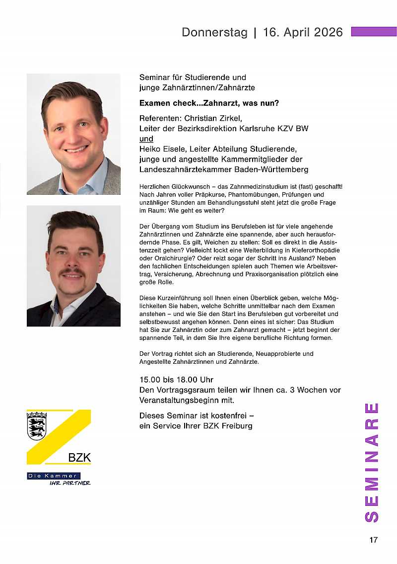 Der Vortrag richtet sich an Studierende, Neuapprobierte und Angestellte Zahnärztinnen und Zahnärzte.