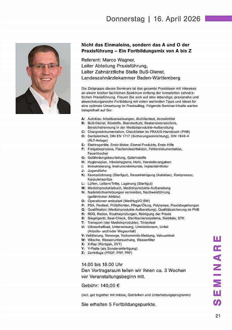 Die Zielgruppe dieses Seminars ist das gesamte Praxisteam mit Interesse an einem breiten fachlichen Spektrum entlang der kompletten zahnärztlichen Praxisführung. Freuen Sie sich auf eine lebendige, praxisnahe und abwechslungsreiche Fortbildung mit vielen wertvollen Tipps und Ideen für eine optimale Umsetzung im Praxisalltag. Folgende Seminar-Inhalte warten beispielhaft auf Sie: