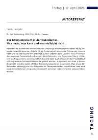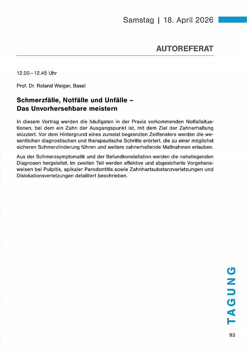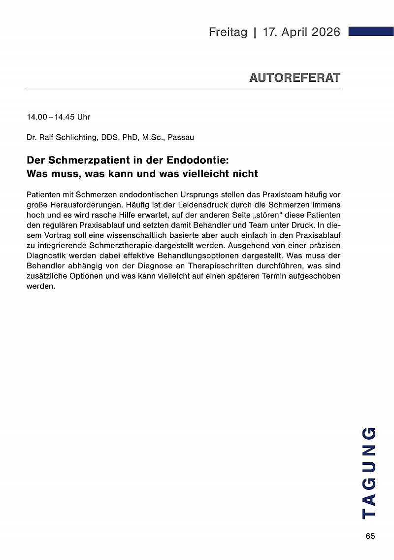 Patienten mit Schmerzen endodontischen Ursprungs stellen das Praxisteam häufig vor große Herausforderungen. Häufig ist der Leidensdruck durch die Schmerzen immens hoch und es wird rasche Hilfe erwartet, auf der anderen Seite "stören" diese Patienten den regulären Praxisablauf und setzen damit Behandler und Team unter Druck. In diesem Vortrag soll eine wissenschaftlich basierte aber auch einfach in den Praxisablauf zu integrierende Schmerztherapie dargestellt werden. Ausgehend von einer präzisen Diagnostik werden dabei effektive Behandlungsoptionen dargestellt. Was muss der Behandler abhängig von der Diagnose an Therapieschritten durchführen, was sind zusätzliche Optionen und was kann vielleicht auf einen späteren Termin aufgeschoben werden.