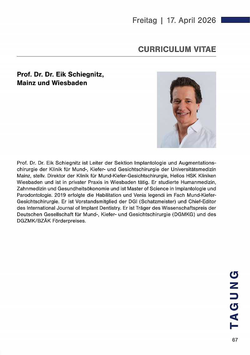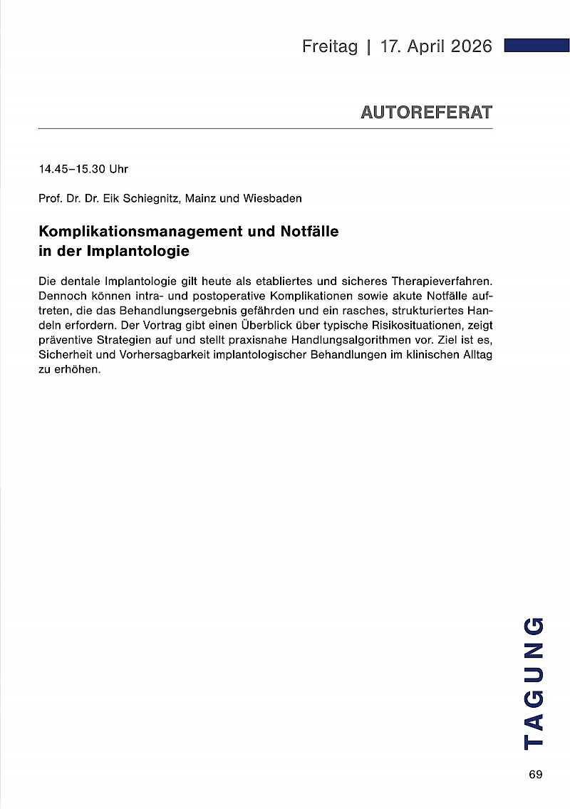 Die dentale Implantologie gilt heute als etabliertes und sicheres Therapieverfahren. Dennoch können intra- und postoperative Komplikationen sowie akute Notfälle auftreten, die das Behandlungsergebnis gefährden und ein rasches, strukturiertes Handeln erfordern. Der Vortrag gibt einen Überblick über typische Risikosituationen, zeigt präventive Strategien auf und stellt praxisnahe Handlungsalgorithmen vor. Ziel ist es, Sicherheit und Vorhersagbarkeit implantologischer Behandlungen im klinischen Alltag zu erhöhen.