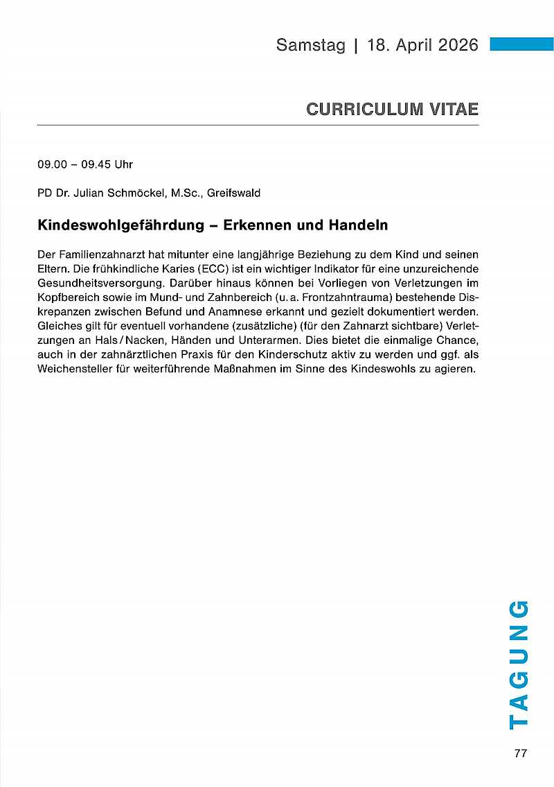 Der Familienzahnarzt hat mitunter eine langjährige Beziehung zu dem Kind und seinen Eltern. Die frühkindliche Karies (ECC) ist ein wichtiger Indikator für eine unzureichende Gesundheitsversorgung. Darüber hinaus können bei Vorliegen von Verletzungen im Kopfbereich sowie im Mund- und Zahnbereich (u.a. Frontzahntrauma) bestehende Diskrepanzen zwischen Befund und Anamnese erkannt und gezielt dokumentiert werden. Gleiches gilt für eventuell vorhandene (zusätzliche) (für den Zahnarzt sichtbare) Verletzungen an Hals / Nacken, Händen und Unterarmen. Dies bietet die einmalige Chance, auch in der zahnärztlichen Praxis für den Kinderschutz aktiv zu werden und ggf. als Weichensteller für weiterführende Maßnahmen im Sinne des Kindeswohls zu agieren.