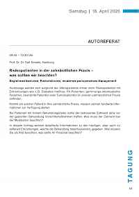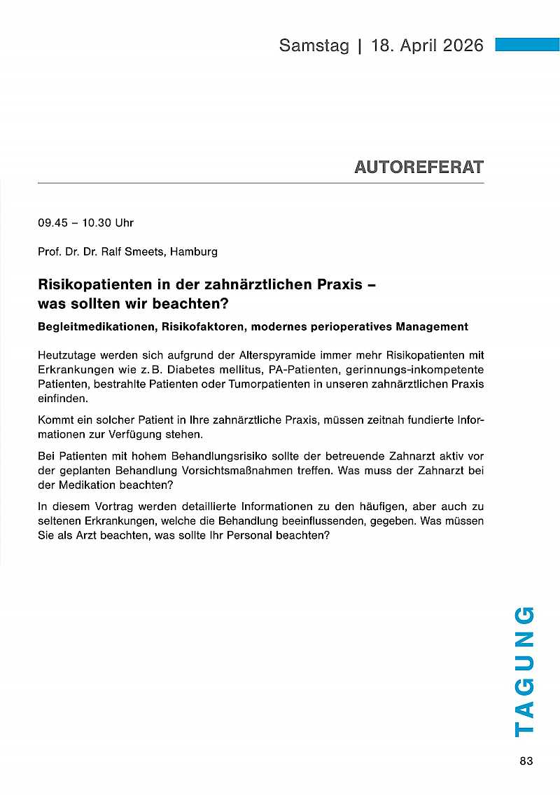 Heutzutage werden sich aufgrund der Alterspyramide immer mehr Risikopatienten mit Erkrankungen wie z.B. Diabetes mellitus, PA-Patienten, gerinnungs-inkompetente Patienten, bestrahlte Patienten oder Tumorpatienten in unseren zahnärztlichen Praxis einfinden.